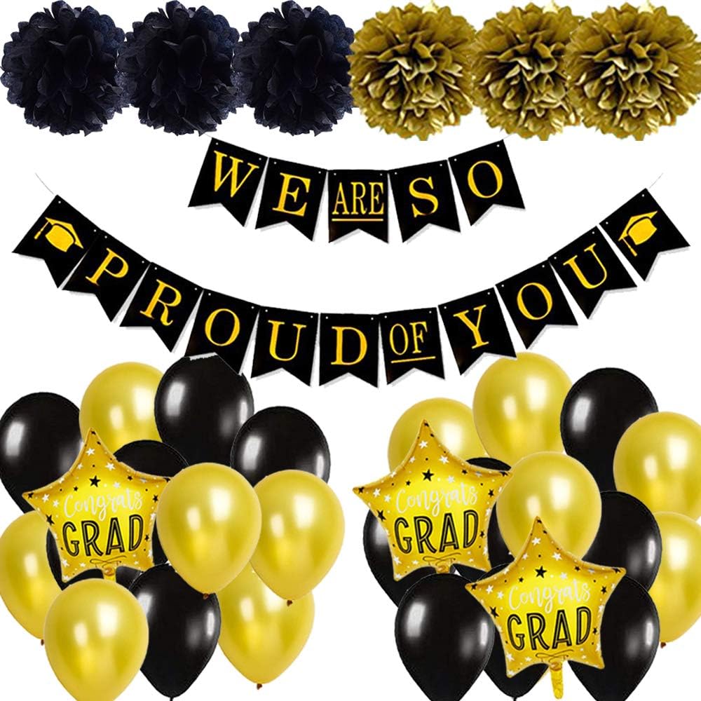 Amazon Com We Are So Proud Of You Banner Black Gold Pompoms Hanging Swirls 2021 Graduation Decorations Graduation Party Supplies 2021 Graduation Banner For High School College Party Decor Class Of 2021 Electronics